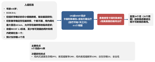患者按脑部病灶数量接受不同局部治疗方案:脑转移灶(BMs)为1~4个的患者原则上接受立体定向放射外科(SRS)20-35 Gy,1~5分次;BMs≥5个的患者原则上接受全脑放射治疗(WBRT)3.0 Gy*10分次。在开始SRS或WBRT的7天内进行卡瑞利珠单抗200 mg Q3w,在卡瑞利珠单抗治疗第1个或第2个疗程联合含铂双药化疗。