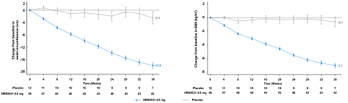 第36周腰围和BMI降低情况:HRS9531注射液8 mg组和安慰剂组的腰围较基线最小二乘均值变化分别为–17.9 cm和–2.5 cm。第36周时,HRS9531注射液8 mg组和安慰剂组的BMI较基线最小二乘均值变化分别为–7.1 kg/m²和–0.7 kg/m²。